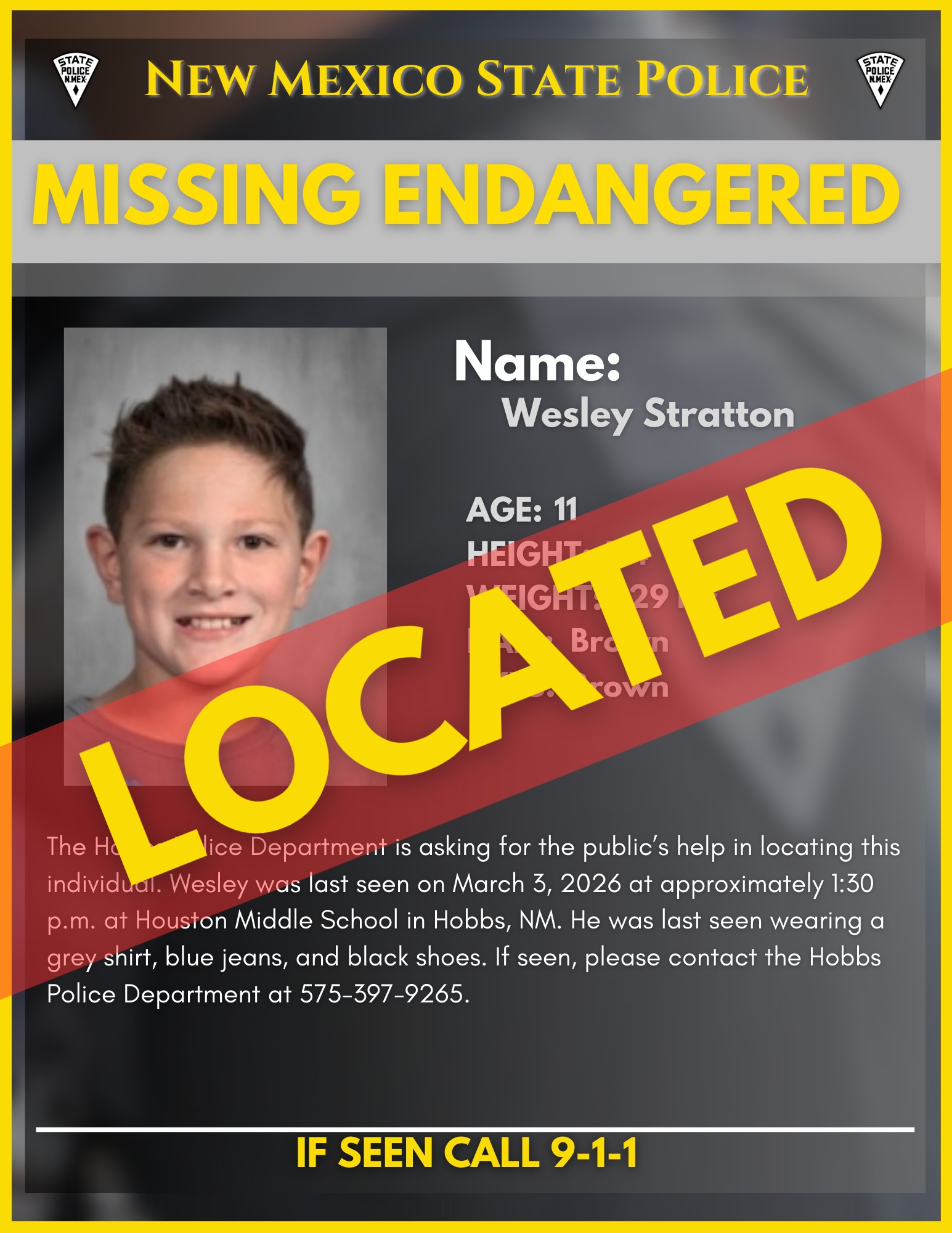 Update: Cancel Missing Endangered Advisory- Hobbs Police Department- Wesley Stratton