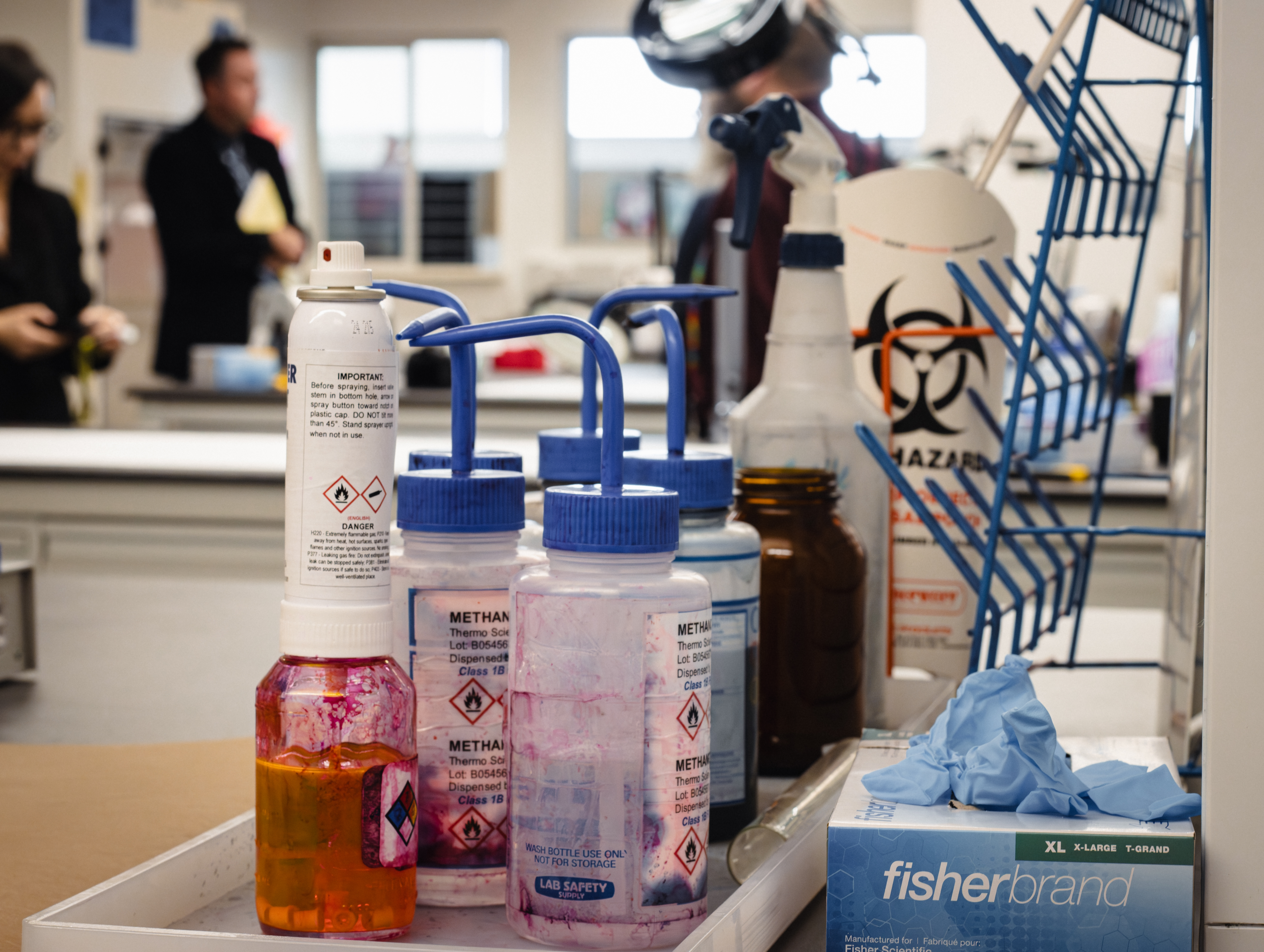Chemicals used for processing (little bottles – delivery by aerosol (porous processing); big bottle of Rhodamine to replenish the wash bottles).